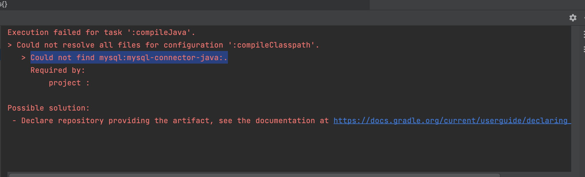 아래와 같이 에러가 발생합니다. gradle에서 dependencies를 잘못 입력했다는 것을 직감할 수 있습니다.